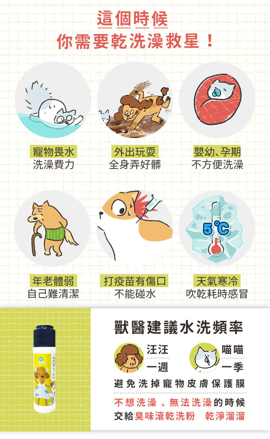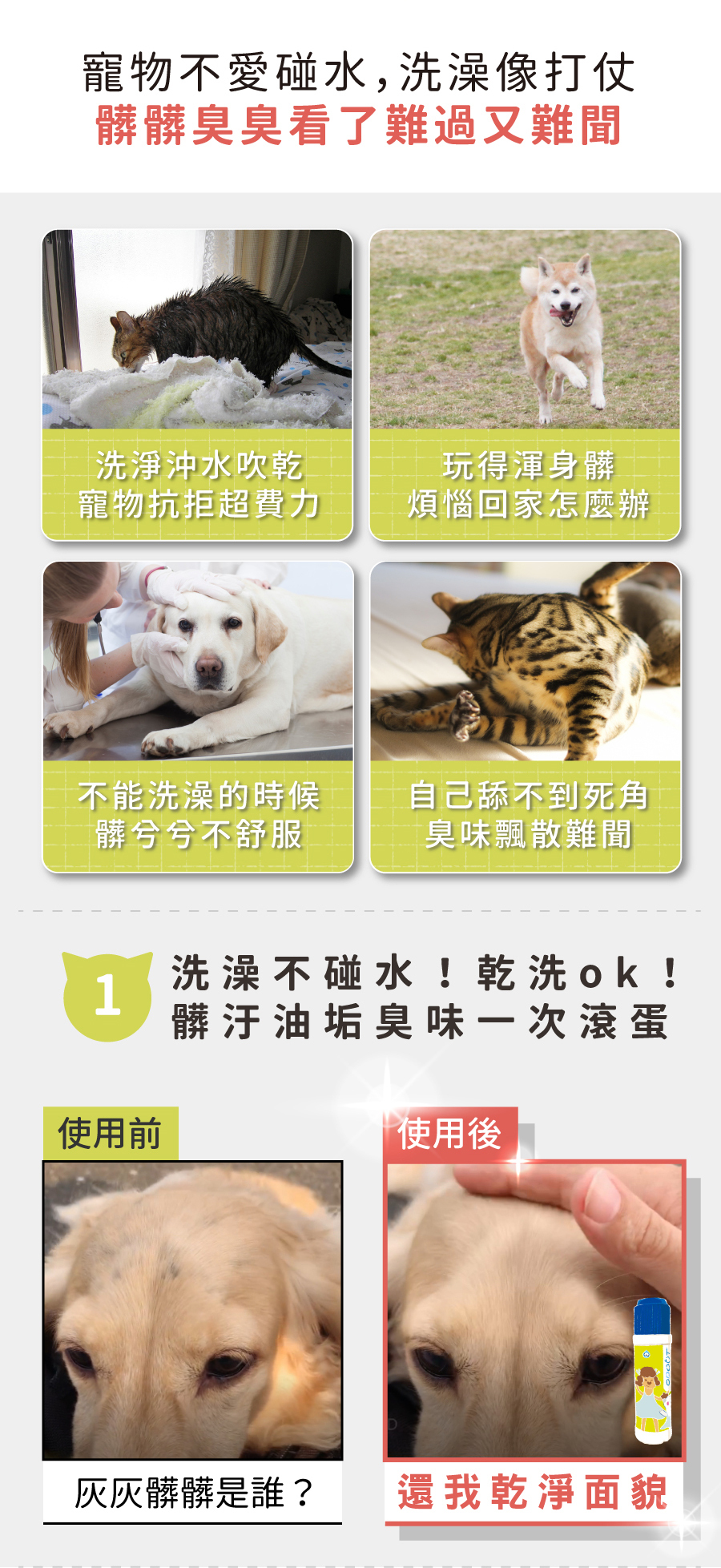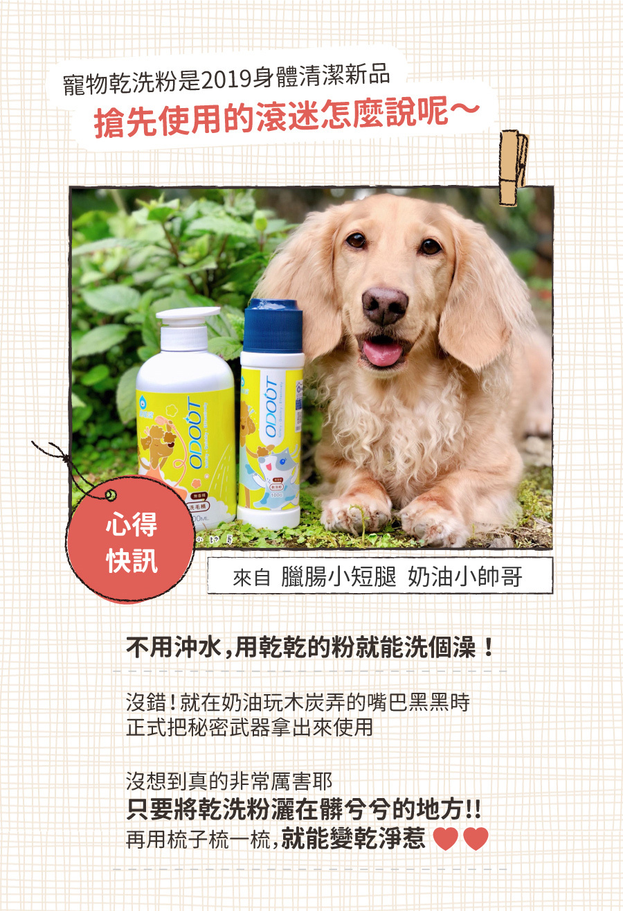 1. 取適量乾洗粉,撒在手上再往毛孩身上搓;或者撒在毛孩身上直接搓。