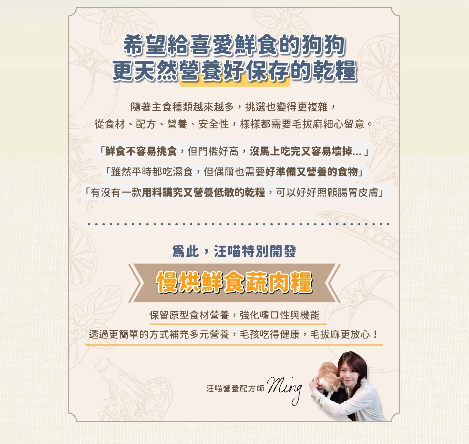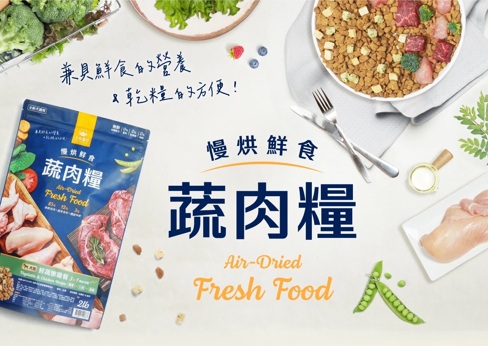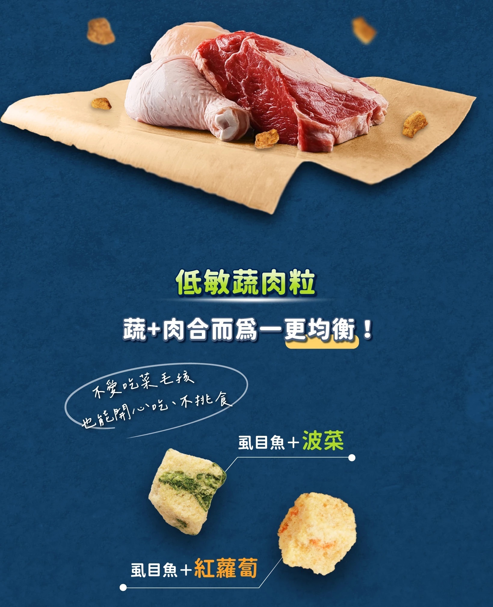 • 慢烘原肉糧+脫水蔬肉粒,肉菜機能一次滿足!