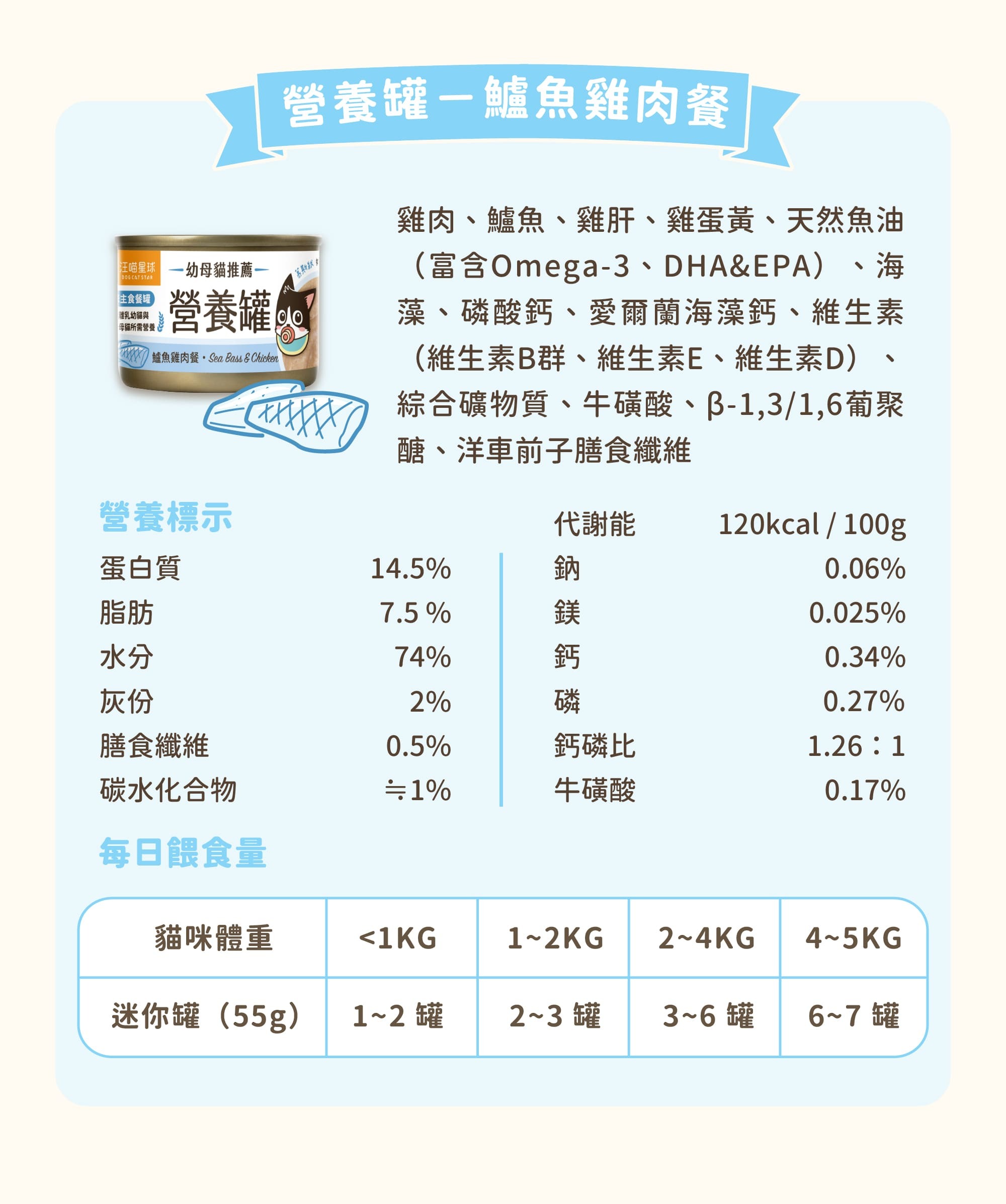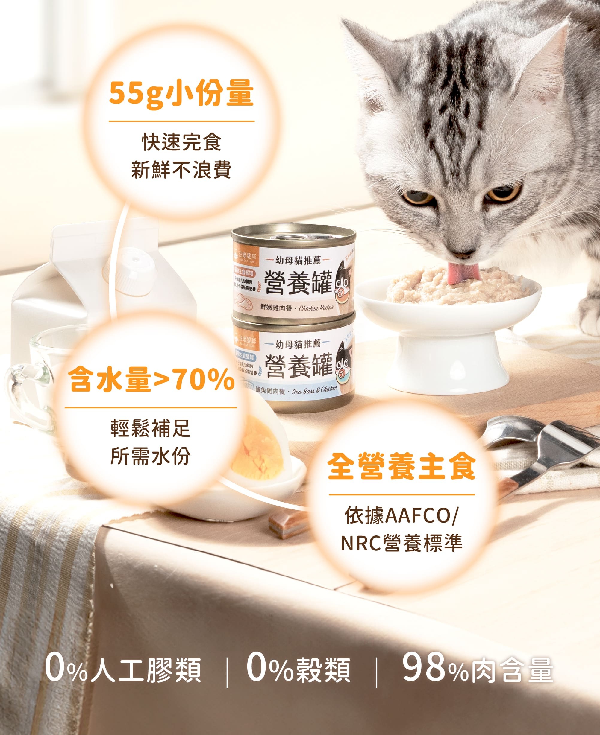 • 產品依據美國 AAFCO/NRC 成幼貓營養標準,可長期作為主食。
