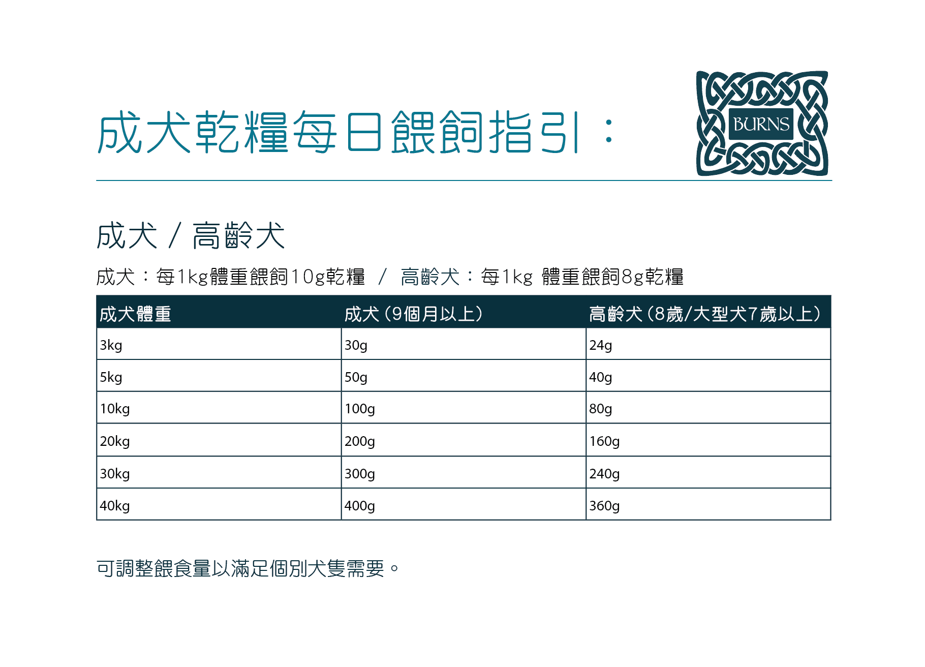 原蛋白質18.5%、原脂肪8%、原纖維2%、原灰質6.5%、 銅18mg/kg、鈉0.18%、鈣1.2%、磷0.85%、鎂0.12%、鉀0.5%、Omega-6脂肪酸1.7%、Omega-3脂肪酸0.2%。