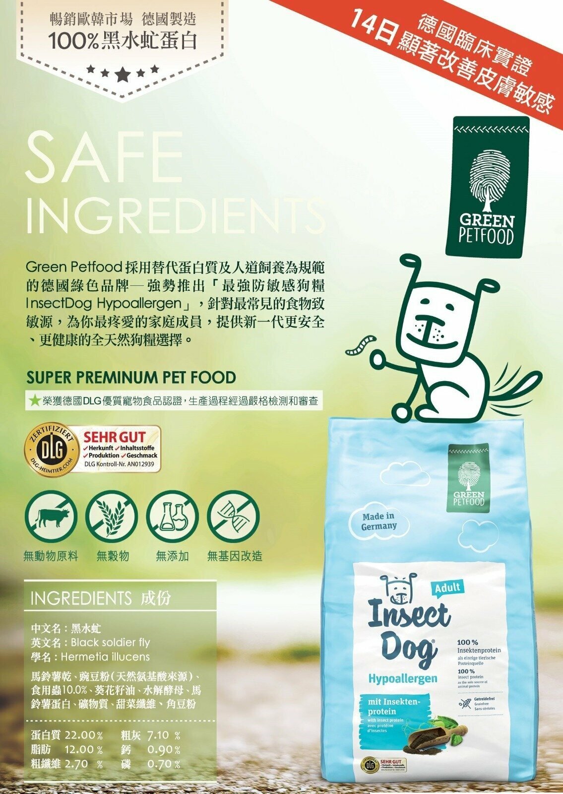 採用荷蘭黑水虻昆蟲 提煉而成 好處 昆蟲蛋白質針對性範圍 皮膚極敏感或腸胃已經有問題的狗隻 一般無穀物寵物糧 只能防止腸胃敏感 但皮膚敏感卻未見顯著功效 矢量可改善皮膚敏感 德國 多年研製 現在才推出市面 香港 暫時未有 類似商品