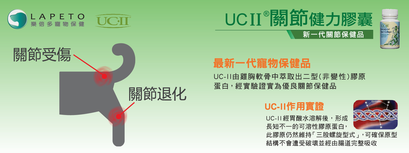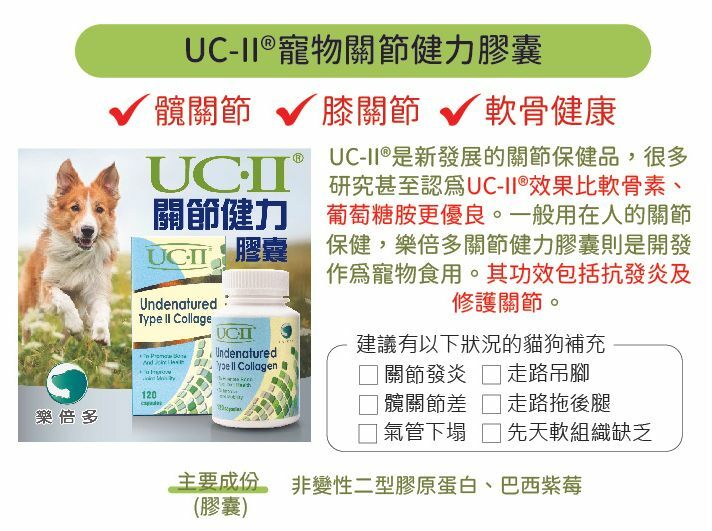 UC-II(非變性二型膠原蛋白(Undenatured Collagen Type II)是新發展的關節保健品,很多研究甚至認為UC-II效果比軟骨素、葡萄糖胺更優良。一般用在人的關節保健,樂倍多關節健力膠囊則是開發作為寵物食用。