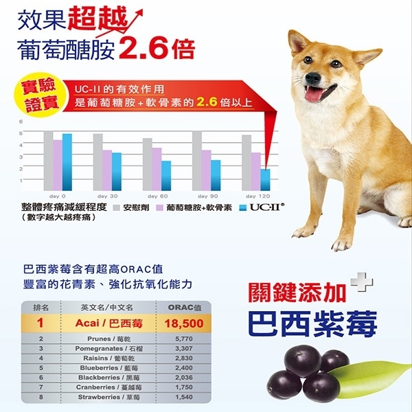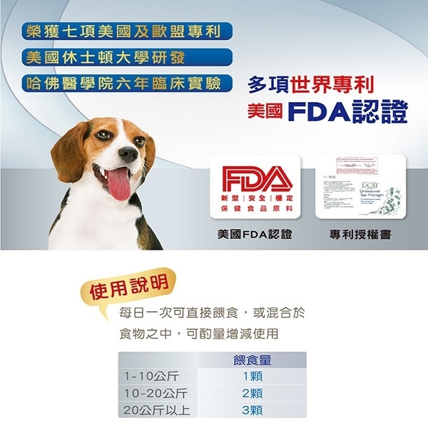 美國FDA認證,寵物狗用骨關節保健品UC-II®(非變性二型膠原蛋白(Undenatured Collagen Type II),美國FDA認證,可以減緩關節疼痛並增生軟組織,是新的關節保健品。UC-II健力膠囊,寵物狗專用的UC-II保健品,新型、穩定、安全,幫助舒緩髖關節問題、退化性關節炎。