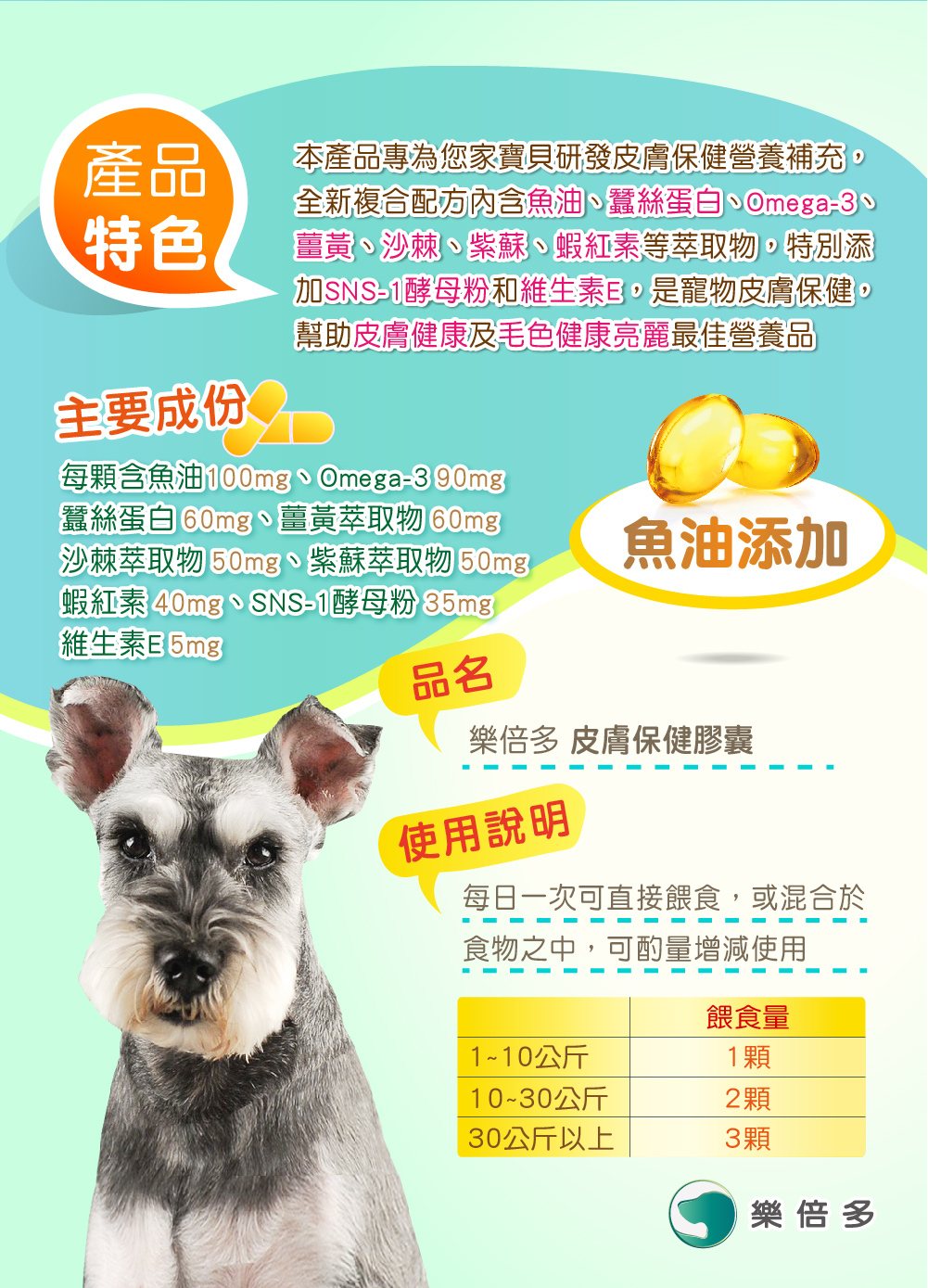 此產品專為您家寶貝研發皮膚保健營養補充,全新複合配方內含魚油、蠶絲蛋白、omega-3、蓋黃、沙棘、紫蘇、蝦紅素等萃取物,特別添加SNS-1酵母粉和維生素E,寵物皮膚保健,幫助皮膚健康及毛色健康亮麗最佳營養品。