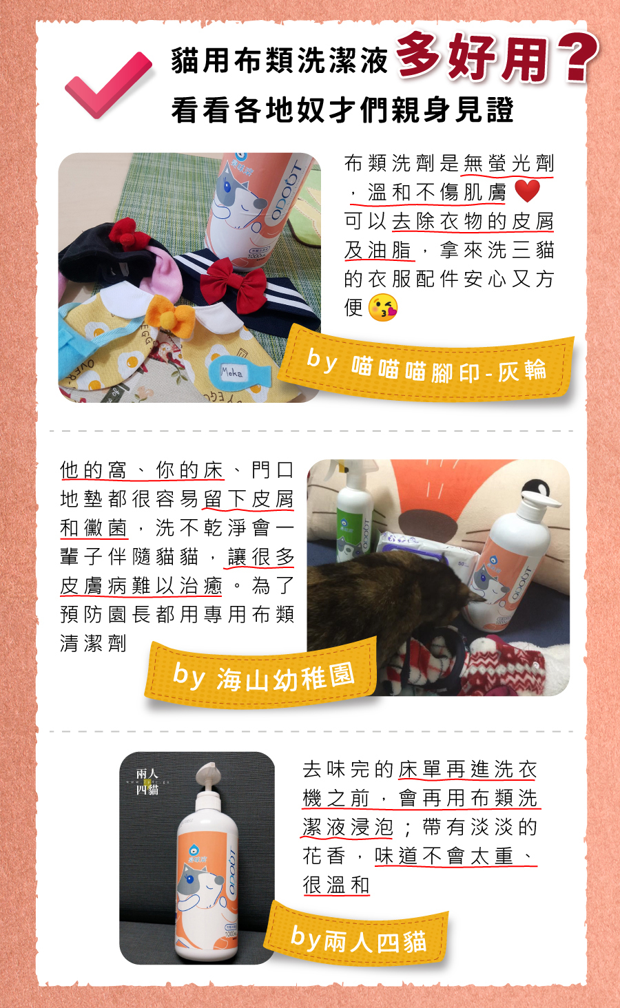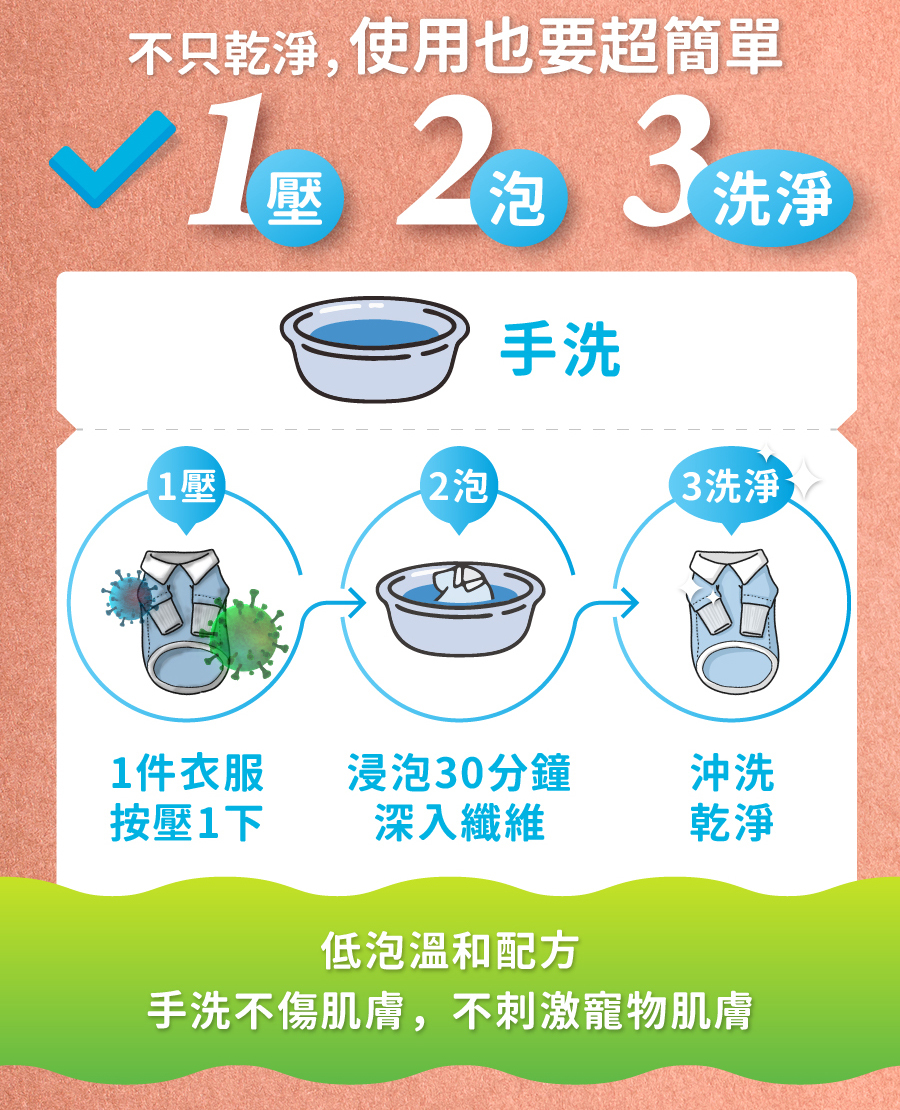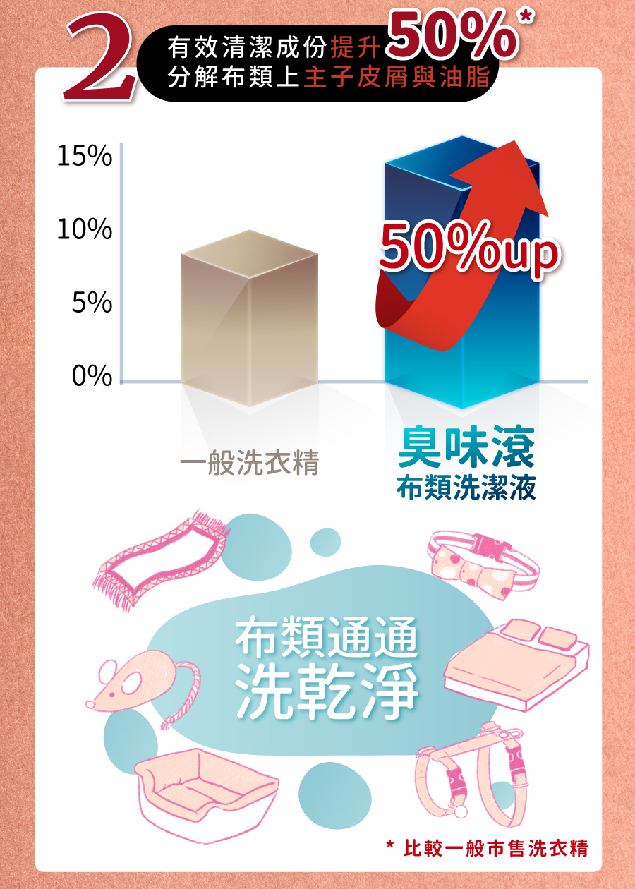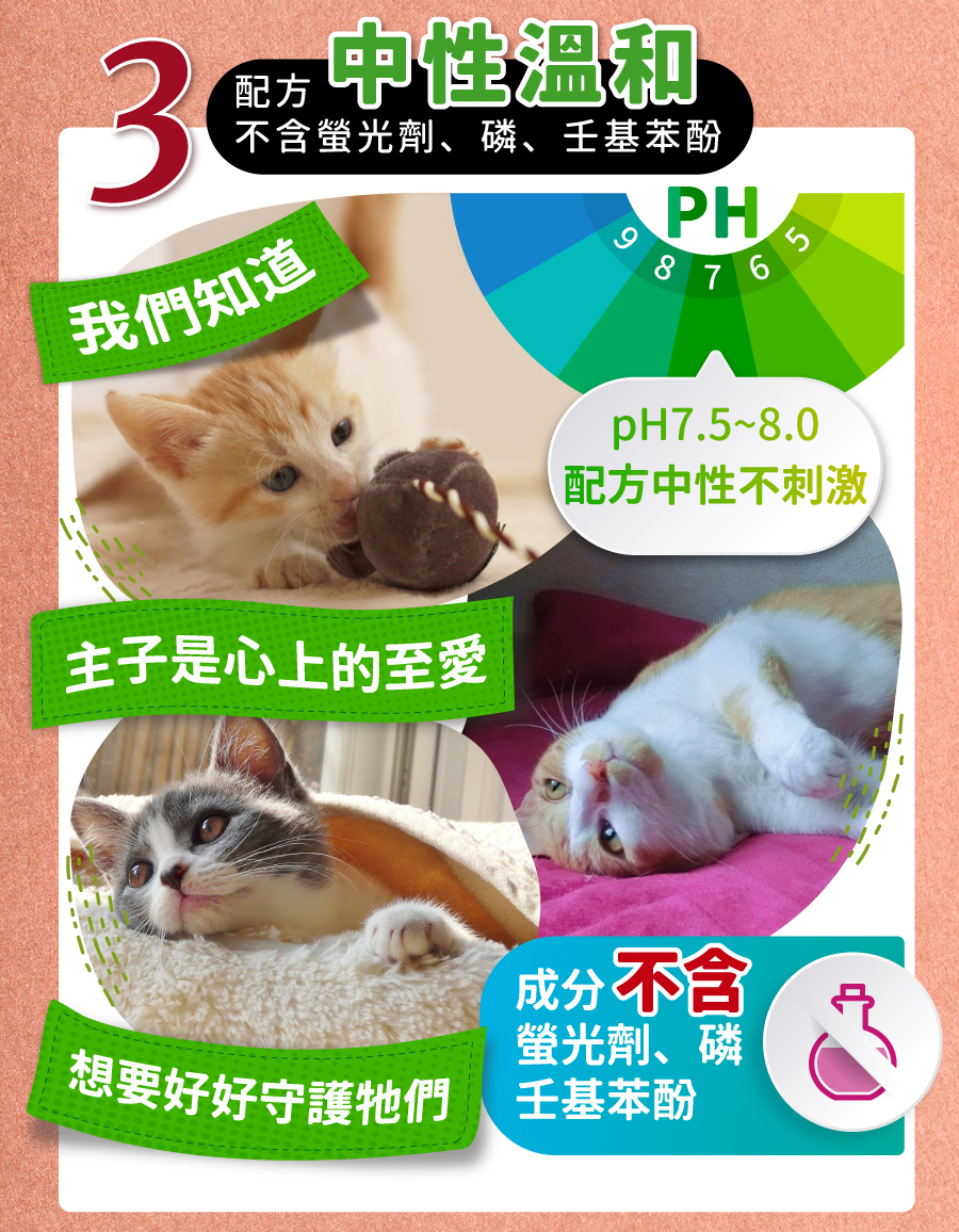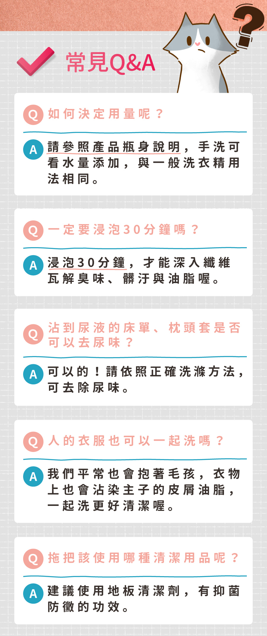 毛孩經常接觸的布類會留有油脂和皮屑,容易滋生細菌並產生異味,因此應用寵物專用的布類清潔劑清洗。本產品含有淡淡花香,中性配方,安全無刺激,保護家人與毛孩的健康。