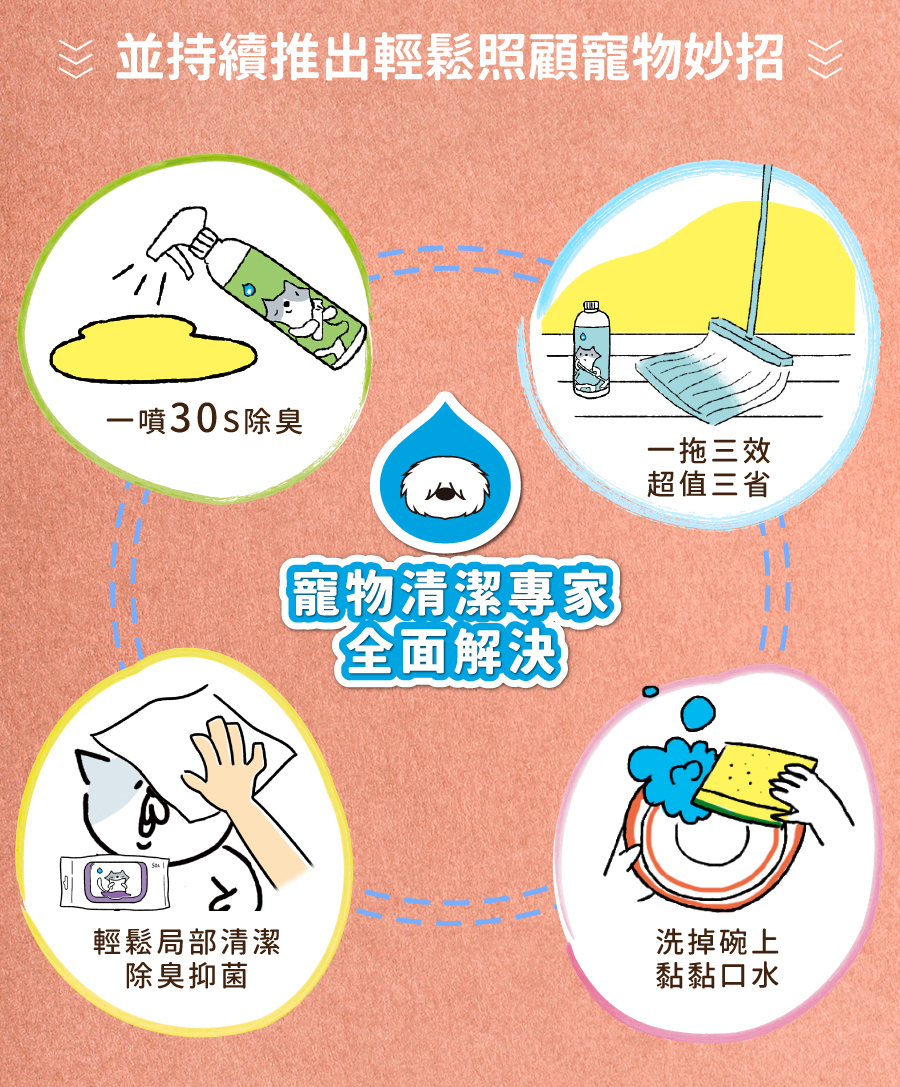 飼主們可以使用能徹底洗淨的臭味滾布類洗潔液,照顧全家的健康。