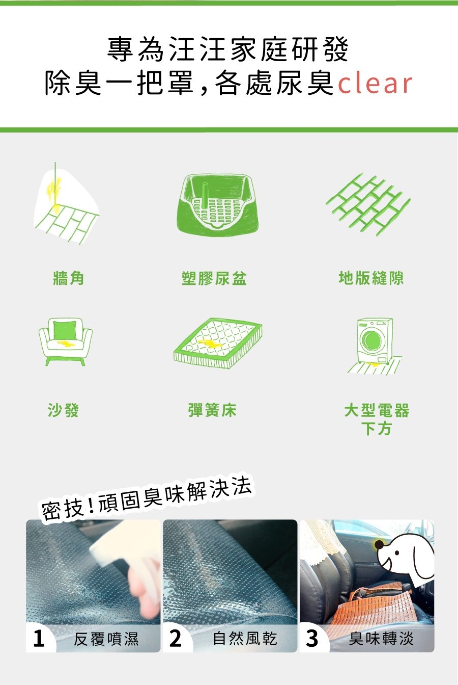 1. 專用除臭配方,針對臭味成份來源(阿摩尼亞)做分解,真正根除臭味。