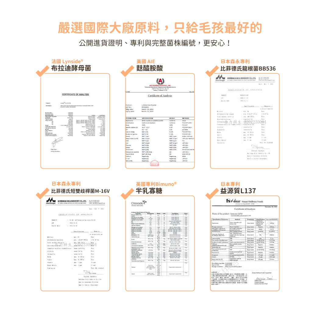 比菲德氏龍根菌BB536、比菲德氏短雙歧桿菌M-16V、嗜酸乳桿菌NCFM、乳酸雙歧桿菌HN019、鼠李糖乳酸桿菌HN001、Lynside®布拉迪酵母菌、BC30®芽孢乳酸菌、日本專利益源質L137、日本天野消化酵素、Bimuno® 半乳寡糖、美國麩醯胺酸、N-乙醯葡萄糖胺、膳食纖維