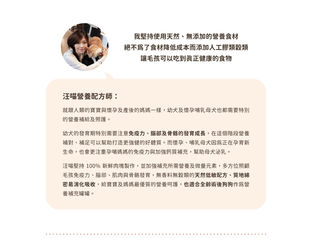 適合寵物:幼犬、懷孕哺乳犬營養補充,亦可作為日常營養補充罐,適合術後修復、體質較弱的狗狗