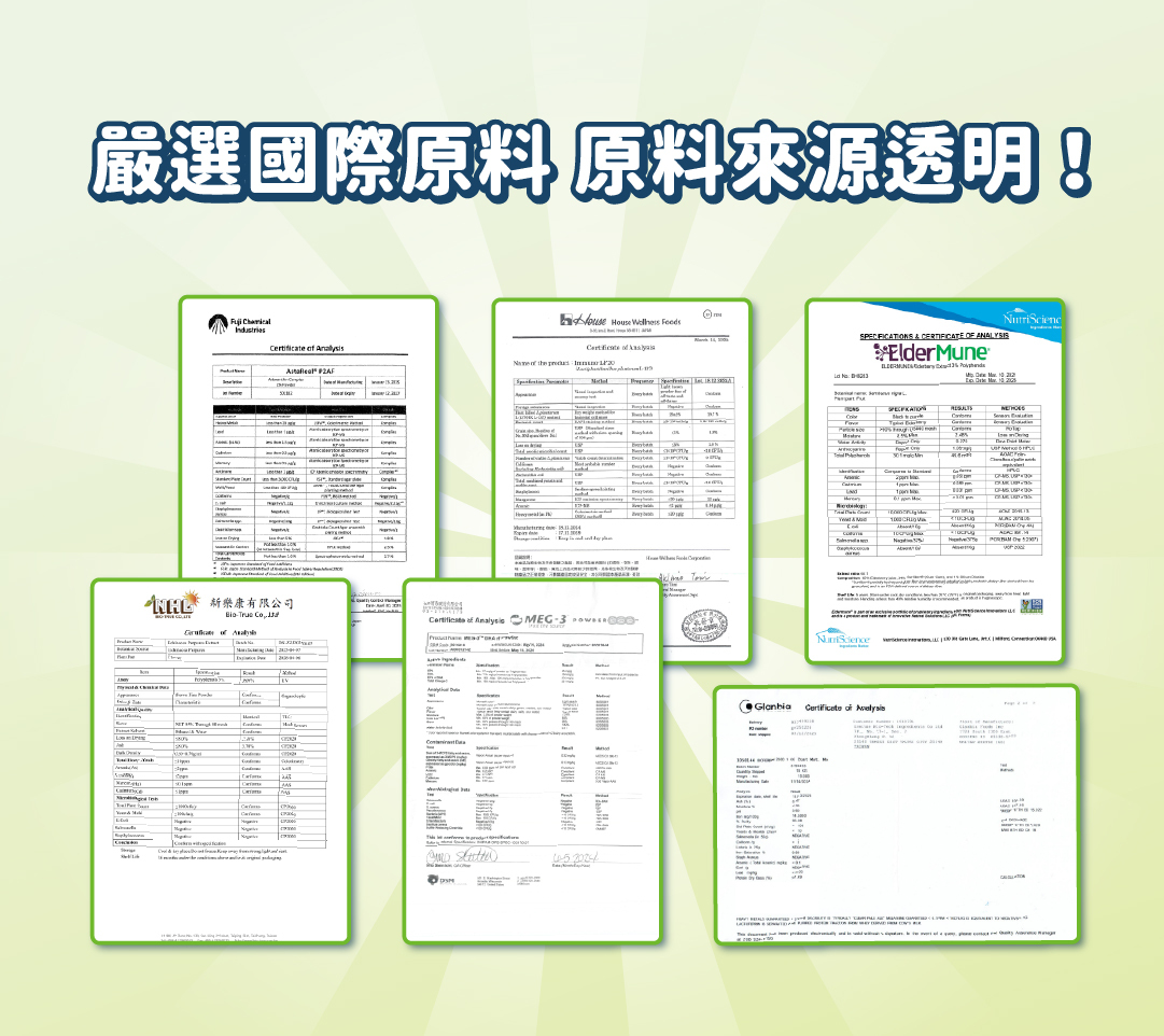 有效成分:N-乙醯葡萄糖胺、紫錐花萃取物、接骨木梅萃取物、魚油粉(含DHA)、酵母鋅、啤酒酵母(含維生素D)、紫蘇萃取物、黑酵母發酵物、維生素C、乳鐵蛋白、植物乳桿菌(益源質L137)、紅藻萃取物(含蝦紅素)、輔酵素Q10、鮭魚抽出物(含蛋白聚醣)