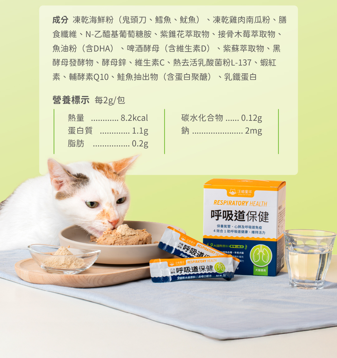 副成分:凍乾海鮮粉(鬼頭刀、鱈魚、魷魚)、凍乾雞肉南瓜粉、膳食纖維