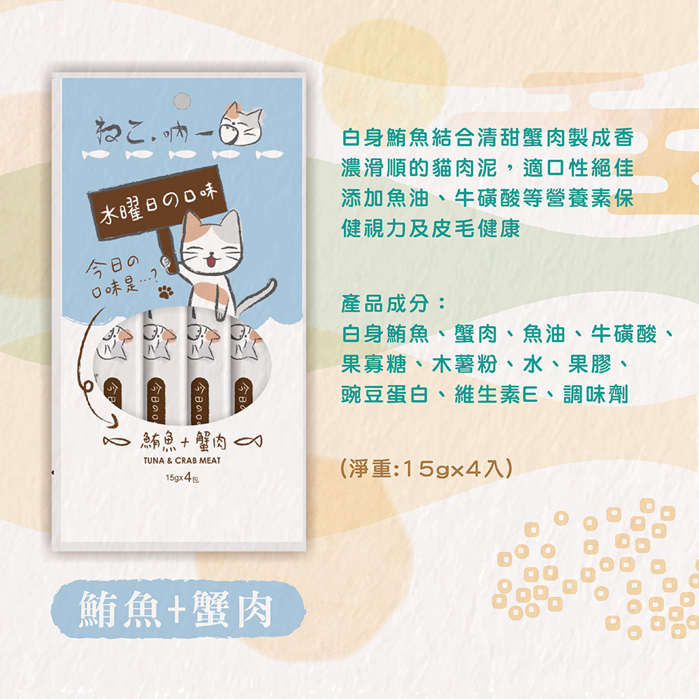 白身鮪魚、蟹肉、魚油、牛酸、果寡糖、木薯粉、水、果膠、碗豆蛋白、維生素E、調味劑