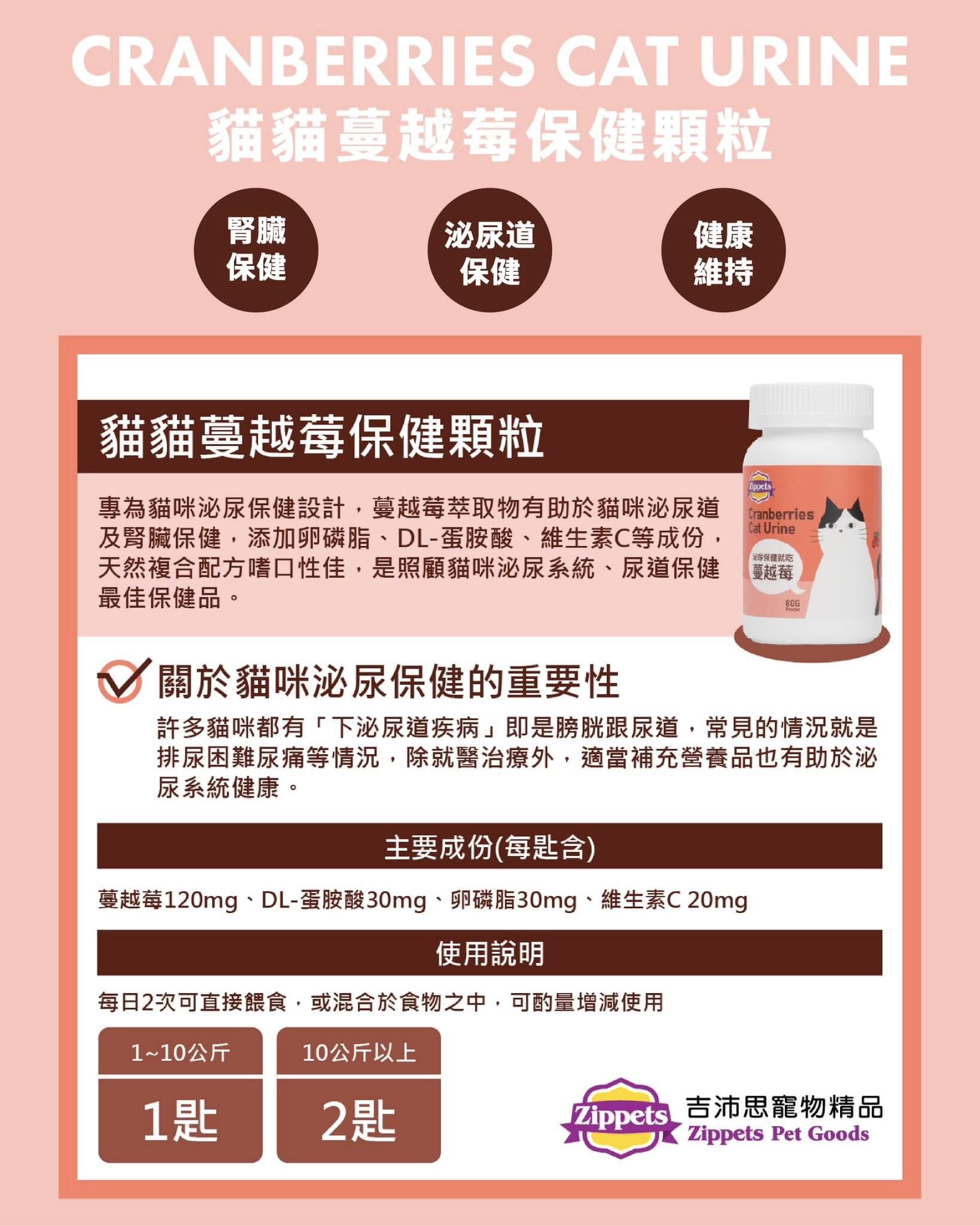 - 主成份蔓越莓萃取物有助於貓咪泌尿道和腎臟保健