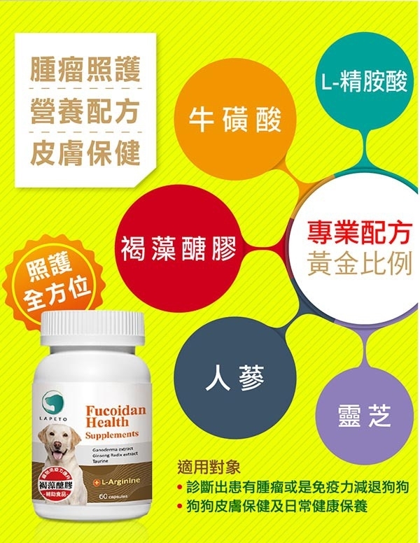 腫瘤是現代毛小孩常見疾病之一,隨著狗狗年齡老化、免疫力下降,容易引發各種腫瘤問題,對抗腫瘤除了傳統的放射治療和外科手術之外,日本研究發現褐藻能夠增加巨噬細胞活性,讓免疫系統更容易辨識出增細胞存在,因此適合做腫瘤輔助保健食品。另外研究也指出褐藻醣膠的多醣體對於皮膚的保健效果良好,並能使毛髮濃密亮麗有光采。