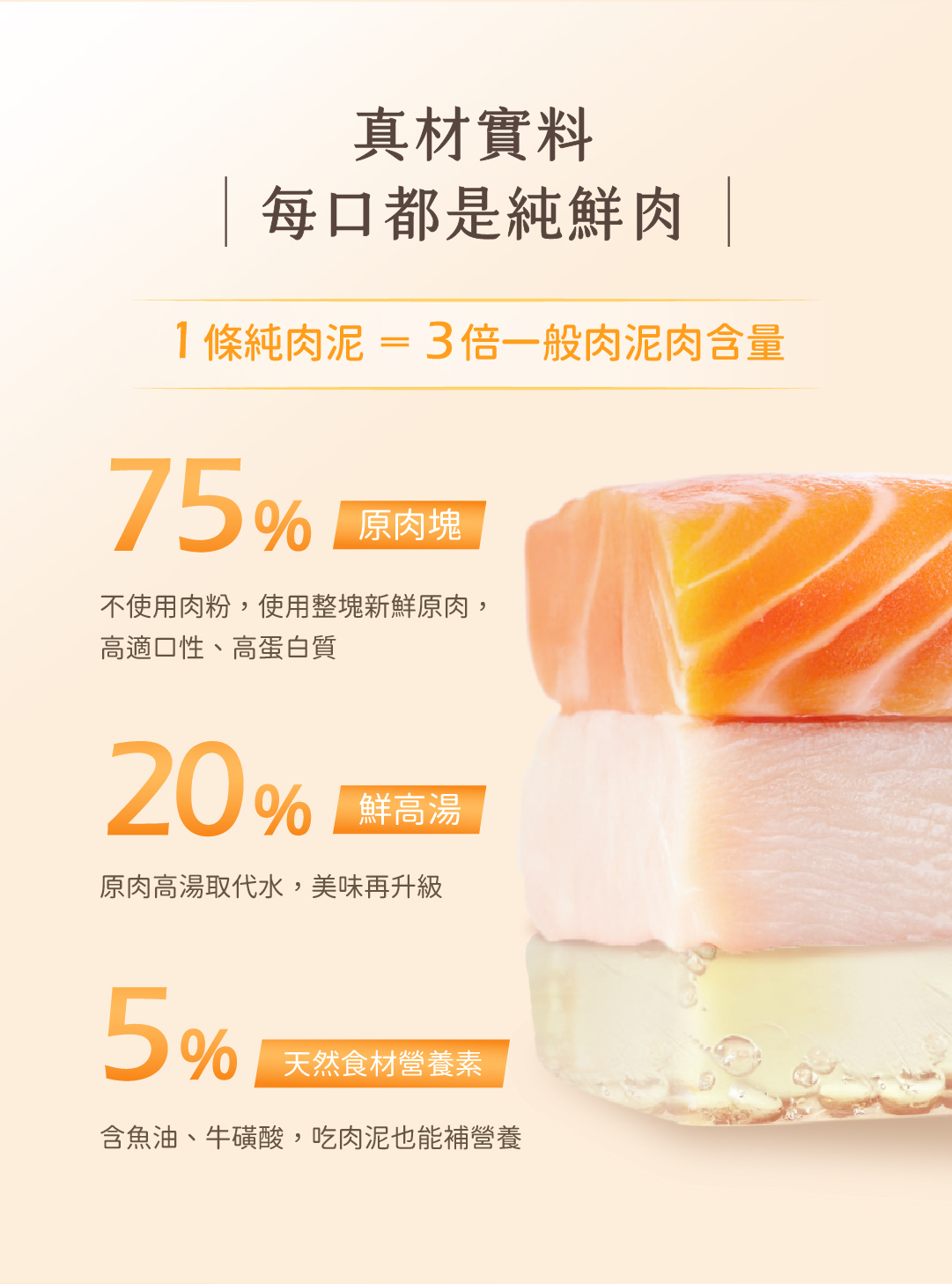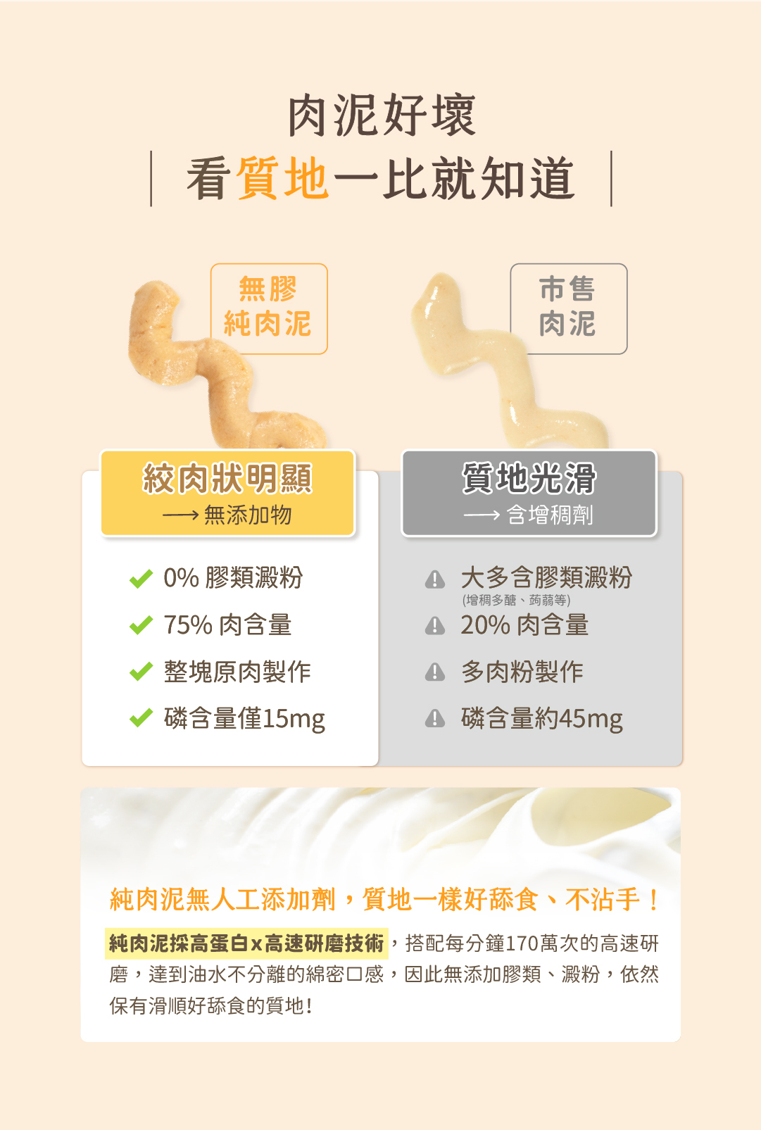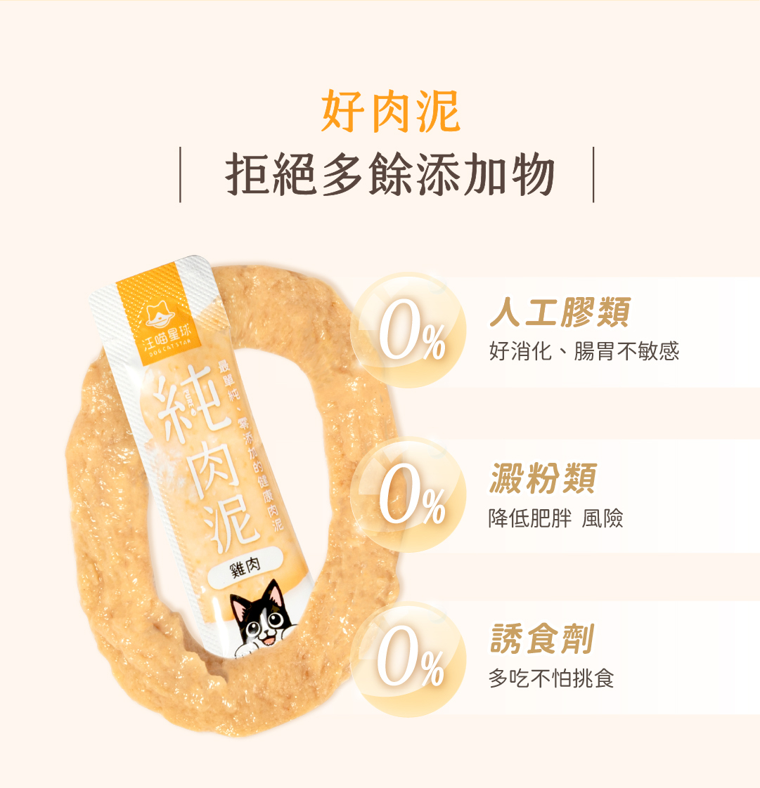 汪喵星球無膠純肉泥沒有額外添加任何的磷鈉、鹽、人工誘食劑、甜味劑等,是相對其他市售肉泥對腎貓更友善的選擇。
