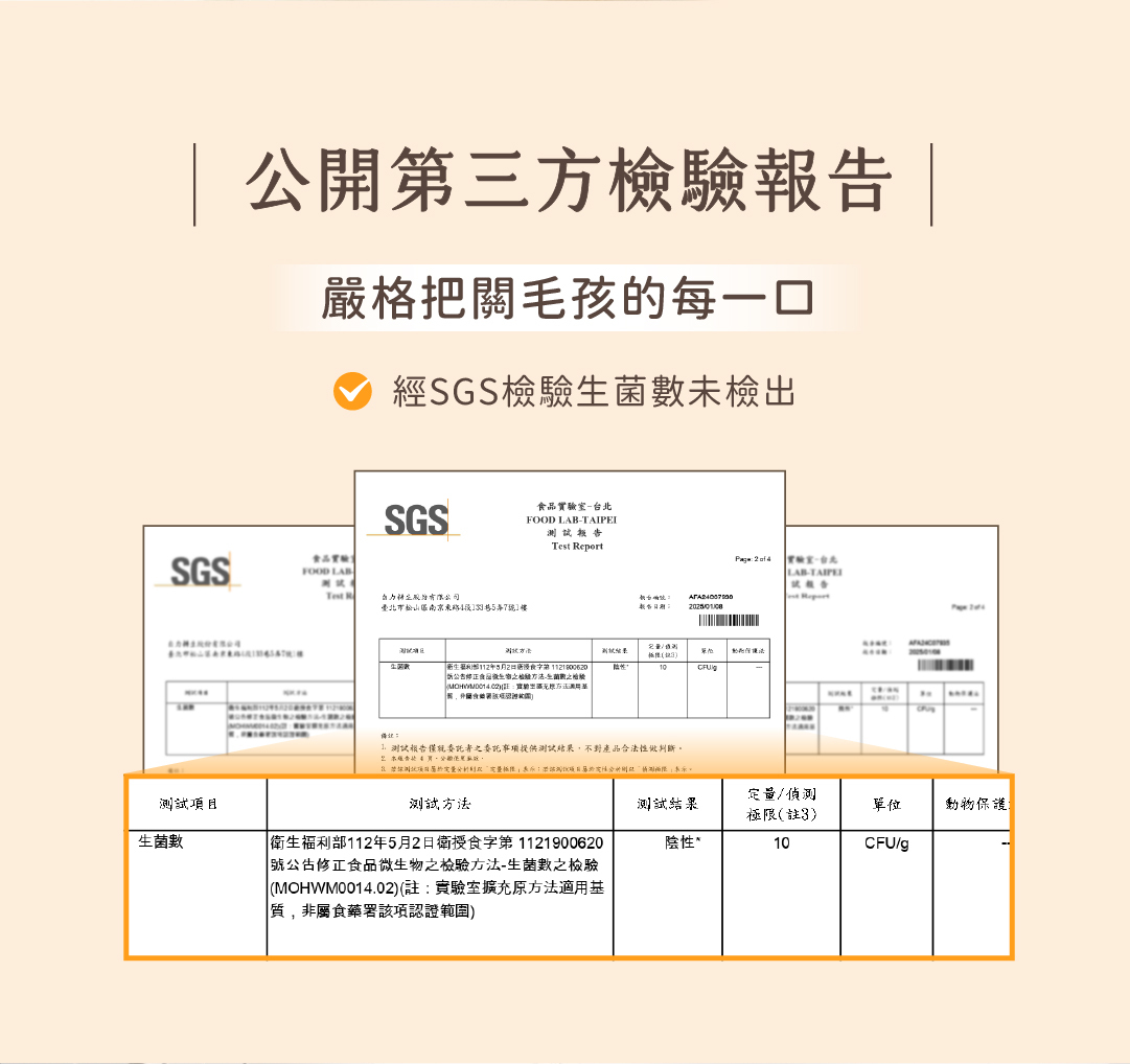 ☑ 無人工膠類 ☑ 無澱粉 ☑ 無誘食劑 ☑ 無防腐劑 ☑ 無色素 ☑ 經SGS檢驗,無生菌數通過